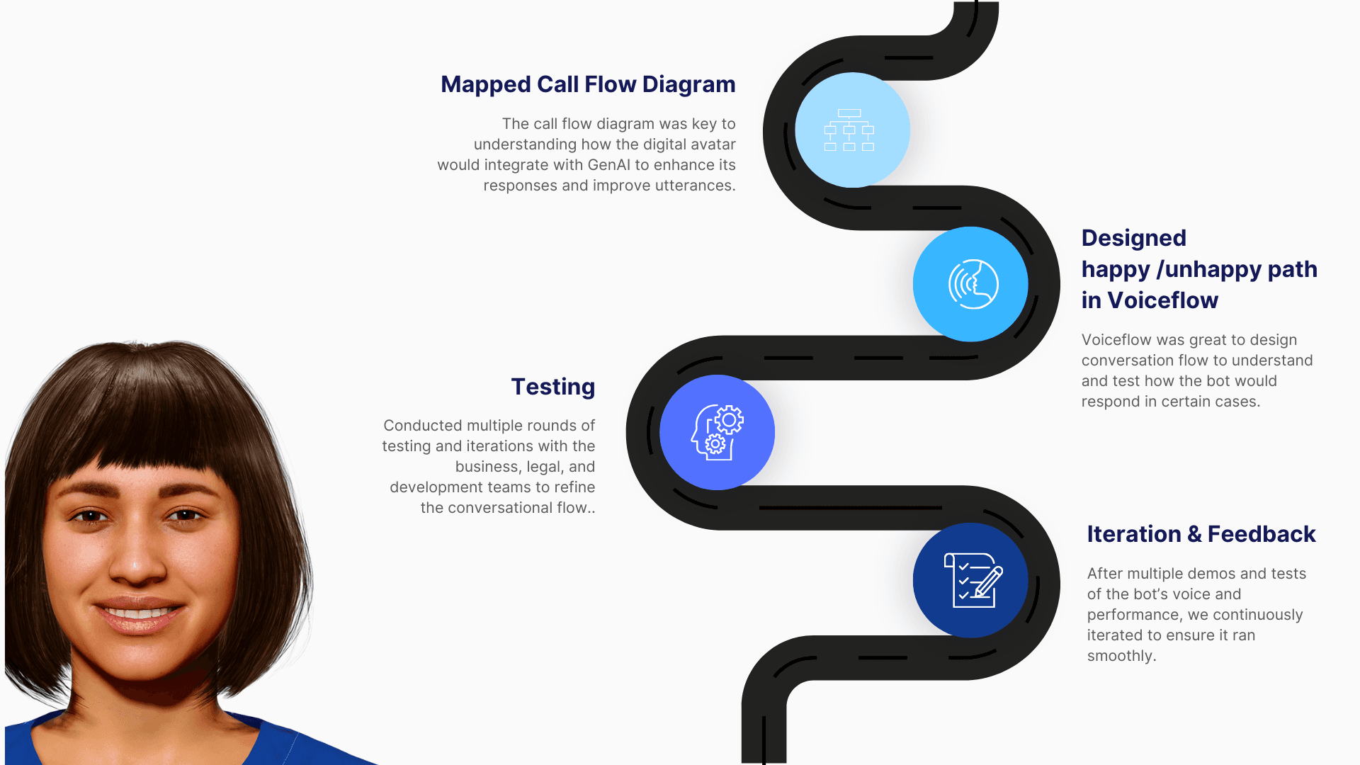 I started by studying how nurse navigators interact with patients and mapped these interactions in Voiceflow. The second goal was to test the digital assistant's voice to ensure it sounded natural, approachable, experienced and supportive.