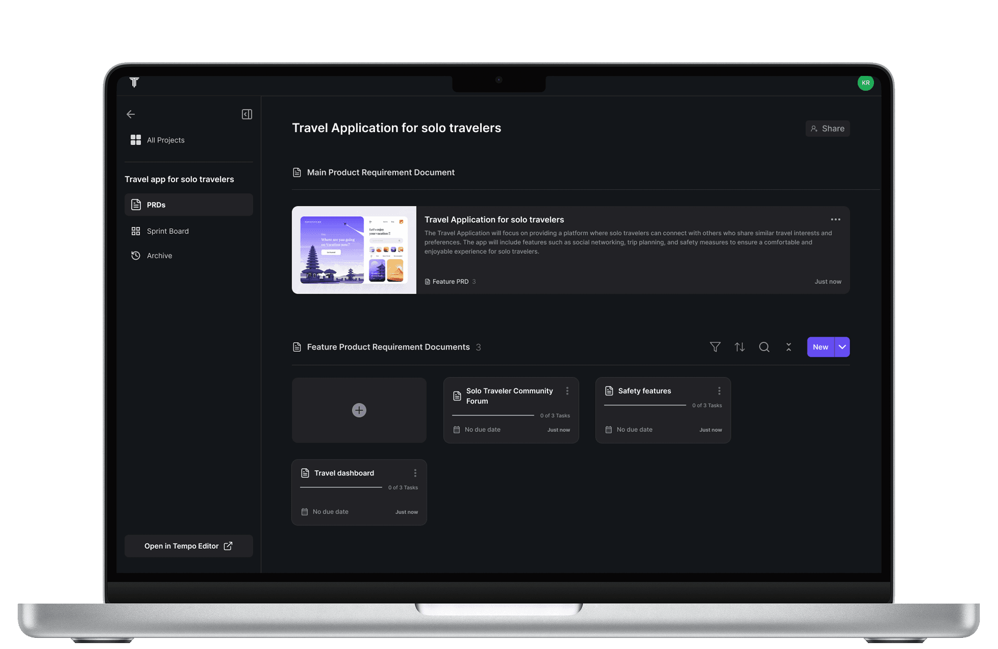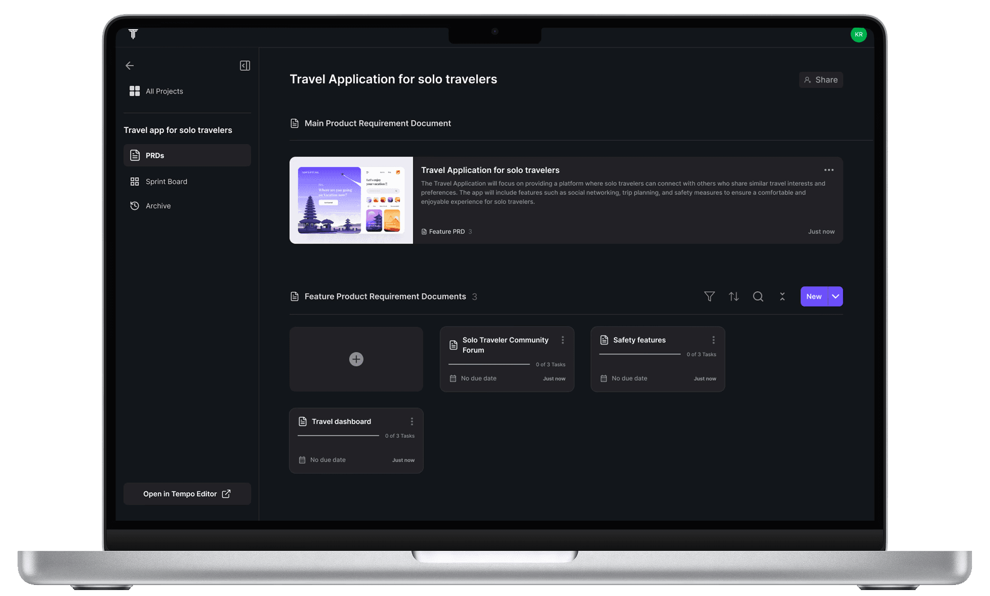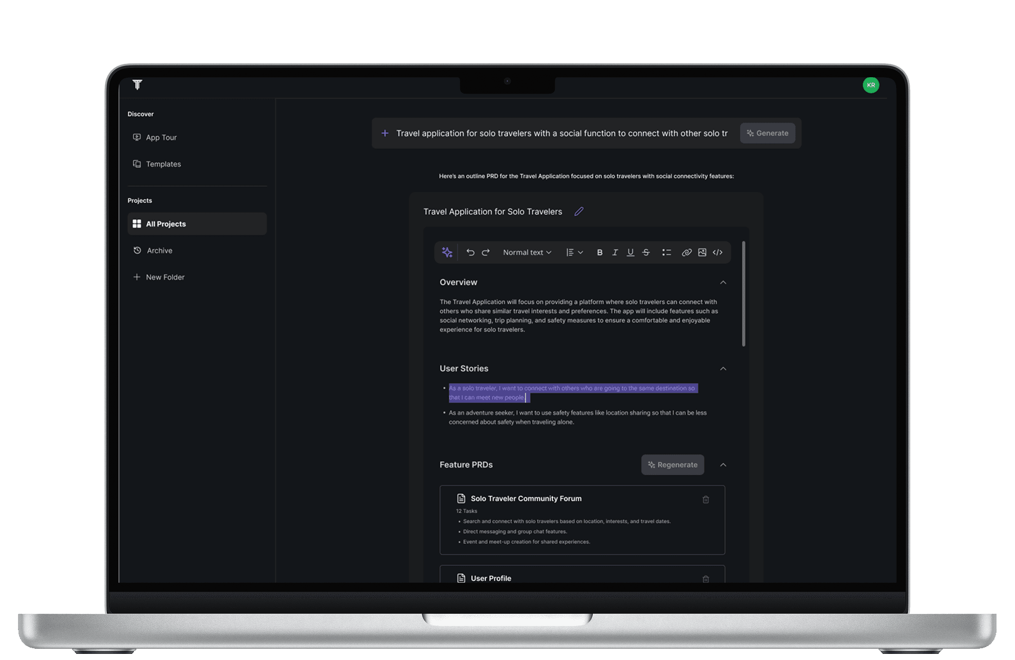 Users can generate a new primary PRD anytime by clicking the ‘+’ button and prompting the AI. Manual PRD addition is also available, informed by usability testing insights.