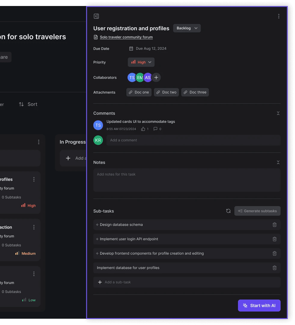 Users can skip the sprint board and start tasks directly in the editor. This flexibility helps startups on tight deadlines, enabling individual contributors to work independently.