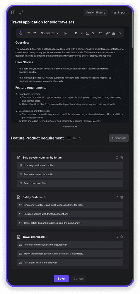 The PRD generation is transparent, explaining why each feature is included. Users can accept the suggestions, manually edit or regenerate the content if needed.